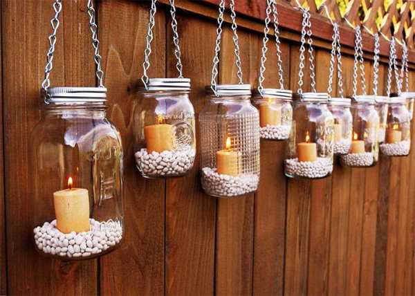 - Чтобы сделать интерьер постройки оригинальным и в то же время позаботиться об освещении в беседке, сделайте светильник своими руками. Вот какие идеи можно найти в интернете: