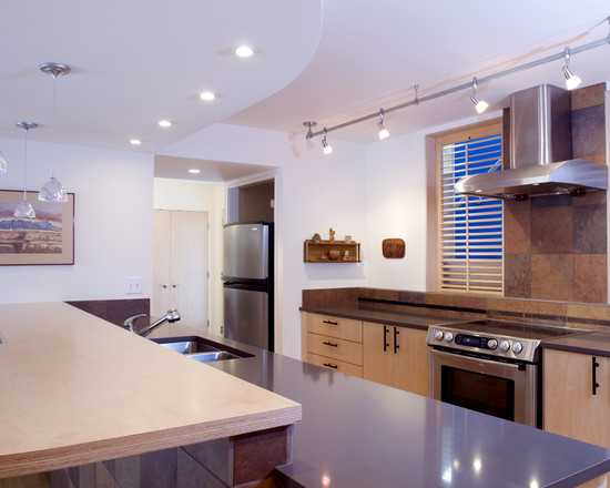 точечные светильники, светильники, прикрепленные к металлической потолочной стойке и люстры с небольшими низко подвешенными плафонами в кухне