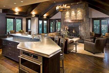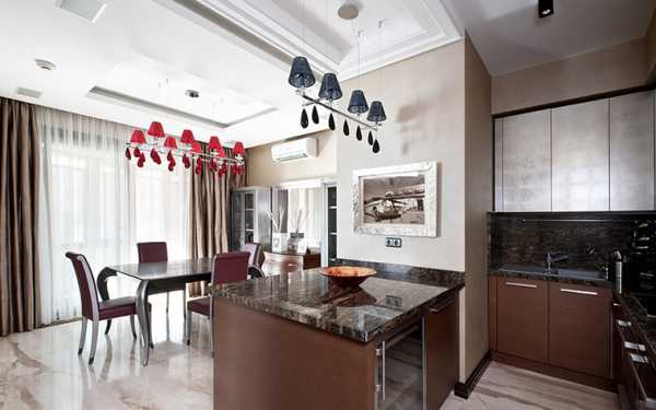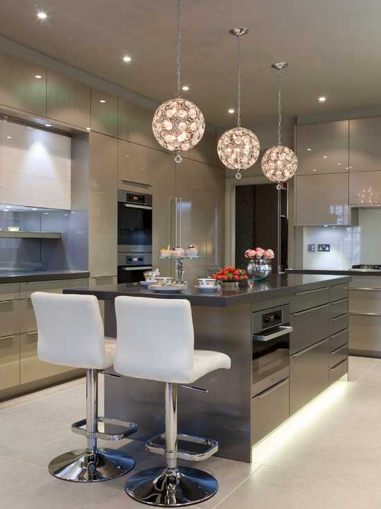 Если в кухонной зоне есть «остров» или отдельно стоящий прилавок барная стойка, придется делать светильники еще и над ними. Это могут быть потолочные варианты или спускающиеся с потолка на длинных шнурах. В некоторых вариантах дизайна кухни совмещенной с гостиной можно ставить классические люстры.