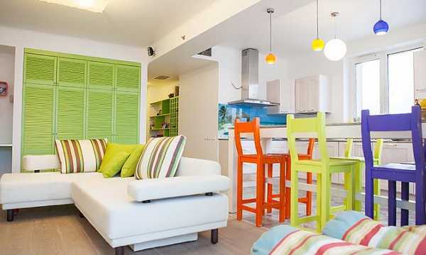 Тем, кто имеет “студию», (около 20 кв м), когда проходная комната совмещена с кухней, дизайнеры советуют помнить о важном моменте: там, где готовятся блюда и обедают, свет должен быть ярче, чем в зоне отдыха. Так как кухня является местом, где работают, занимаются кулинарией, освещение должно быть достаточно ярким, но над диваном такая подсветка будет раздражать.