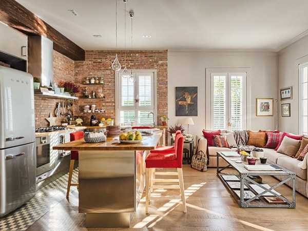 Более комфортно человек себя чувствует в просторных помещениях, чем большинство наших квартир, да и многих частных домов, не грешат. Комнаты еще могут быть более-менее приличных размеров, а вот кухни часто откровенно маленькие. Особенно в знаменитых «хрущевках». Вот и возникает идея перепланировки. Самый популярный вариант — объединение кухни и гостиной или столовой. За счет того, что уходит стена появляются дополнительные метры, а правильно оформленный интерьер кухни совмещенной с гостиной способен усилить ощущение. О том, как можно оформить объединенные помещения и пойдет речь.
