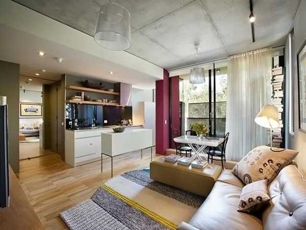Интерьер кухни совмещенной с гостиной небольшого рамера
