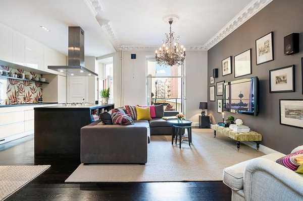 Большая люстра, как освещение в кухне гостиной, выглядит очень красиво, но ее не вешают в маленьких студиях, особенно если комната достаточно узкая. Этот интерьер предполагает использование мелких источников света, выделяя каждым отдельно определенные объекты. Представьте себе магазин с огромной хрустальной люстрой и небольшими стеллажами. Вам ведь захочется рассматривать товар в нем в последнюю очередь.