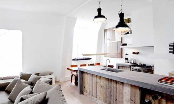 Даже небольшого перепада в несколько сантиметров достаточно для того, чтобы помещения визуально разделялись. А если добавить еще и разную фактуру и/или цвет, эффект становится более заметным. С практической точки зрения удобнее, когда место, где готовится еда, находится чуть ниже. Так мусор, который при этом непременно появляется меньше разносится. Жаль, что это не всегда можно реализовать.
