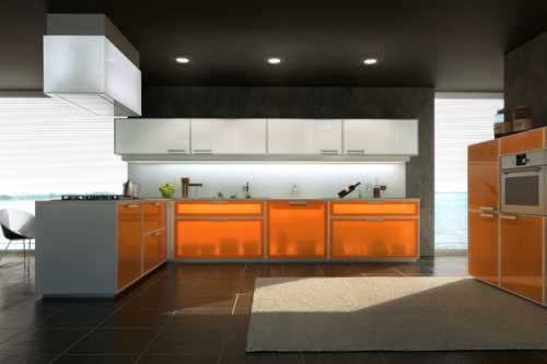 Освещать пространство кухни нужно не только наружным светом, но и использовать в этом помещении специфическую подсветку, которая очень уместна внутри закрытых конструкций навесных шкафов и в выдвижных ящиках. Это будет не только практическое решение, но и хороший способ украшения пространства, особенно если фасады вашей мебели содержат витражное или матовое стекло.