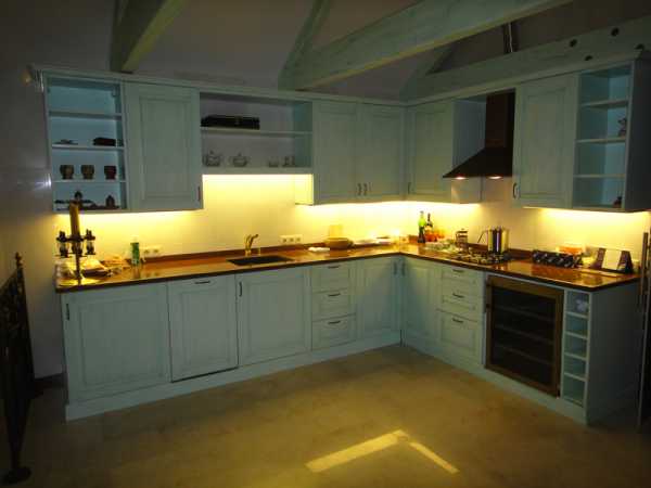 На кухне проблему освещенности рабочих поверхностей частично можно решить, установив на нижнем торце подвесных шкафов лампы или светодиодную ленту. Они и освещенность дадут, и приподнимут шкафчики визуально.