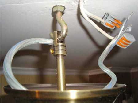 Самым важным в процессе монтажа люстры является выбор места ее расположения. Обычно ее размещают в том участке ванной, где больше всего необходим свет. Остальное пространство освещается дополнительными приборами. Каркас под люстру формируется из небольших металлических ножек и деревянной планки. Эта планка будет являться опорой для люстры. Именно она не дает полотну провиснуть от тяжести прибора. Основание крепится к потолку, только после этого натягивают полотно. После этого на материал крепится кольцо на клей. В нем прорезается дырка, в нее выводится проводка. Поверх кольца к планке крепится специальный металлический профиль.