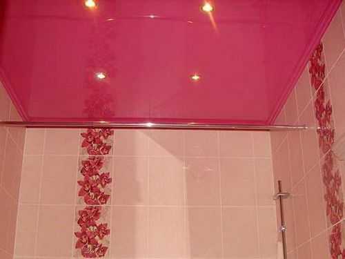 Фиолетовый натяжной потолок в ванной с точечным освещением.