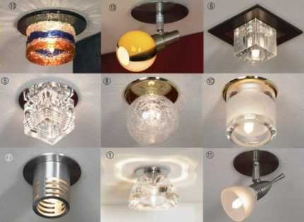 Отечественные производители предлагают светильники для потолков преимущественно с обычными лампами накаливания. У зарубежных производителей большой выбор галогенных моделей.