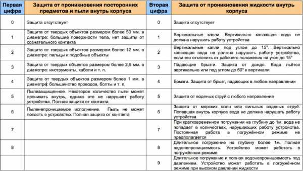 Электрооборудование имеет индекс защиты IP. Первая цифра – это степень защиты прибора от механических повреждений, а вторая указывает на его способность препятствовать проникновению влаги