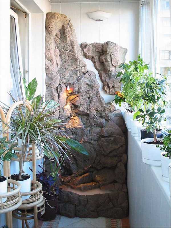 В дизайне лоджий можно использовать не только фонтаны, но и мини-пруды, водопады. Движущаяся «живая» вода смотрится всегда интересно. Особенно эффектны подобные аксессуары в интерьере лоджий природной тематики и зонах релакса, хотя по большому счету, если выбрать подходящий тип объекта ним можно дополнить балкон, оформленный в любом стиле.