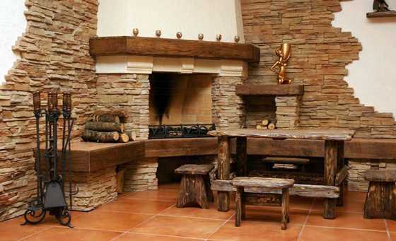 С его помощью вполне реально превратить даже стандартную городскую квартиру в подобие старинного замка или охотничьего домика в стиле кантри. Материал хорошо сочетается с деревом, штукатуркой, стеклом, хромированной сталью. Оригинально смотрятся и комбинации разных фактур одного и того же камня. Например, шероховатые, с трещинками фрагменты очень выразительно контрастируют с гладкими полированными плитками. По физико-механическим свойствам искусственный камень приближается к природному. При этом он дешевле, проще в обработке и удобнее в укладке. К тому же ему можно придать любой цвет, сохранив высокую степень тоновой однородности.