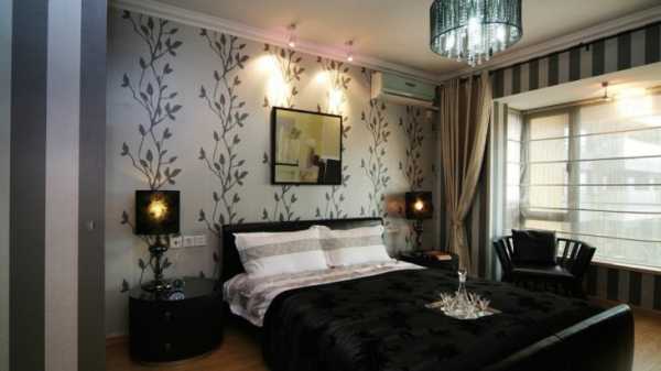 Дизайн стен комнаты из двух видов шпалер предполагает, что однотонные совпадают с одним из трех основных тонов рисунка. Их стиль созвучен мебели. Для штор следует подобрать оттенок, который соответствие фону обоев с рисунком.