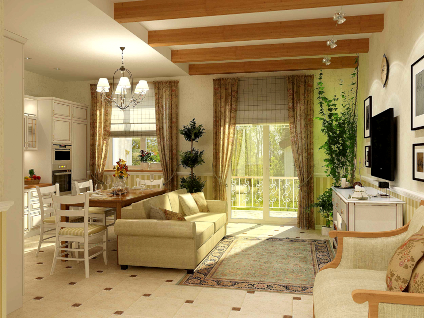 Мебель и отделка только из натуральных материалов. На полу – паркет, для стен и потолка допустим гипсокартон, чтобы добиться идеально ровных поверхностей. Светильники в кухне и гостиной должны быть с хрустальными элементами. Над обеденным столом размещается люстра. Для кухонной зоны можно выбрать точечные светильники с хрустальным декором.