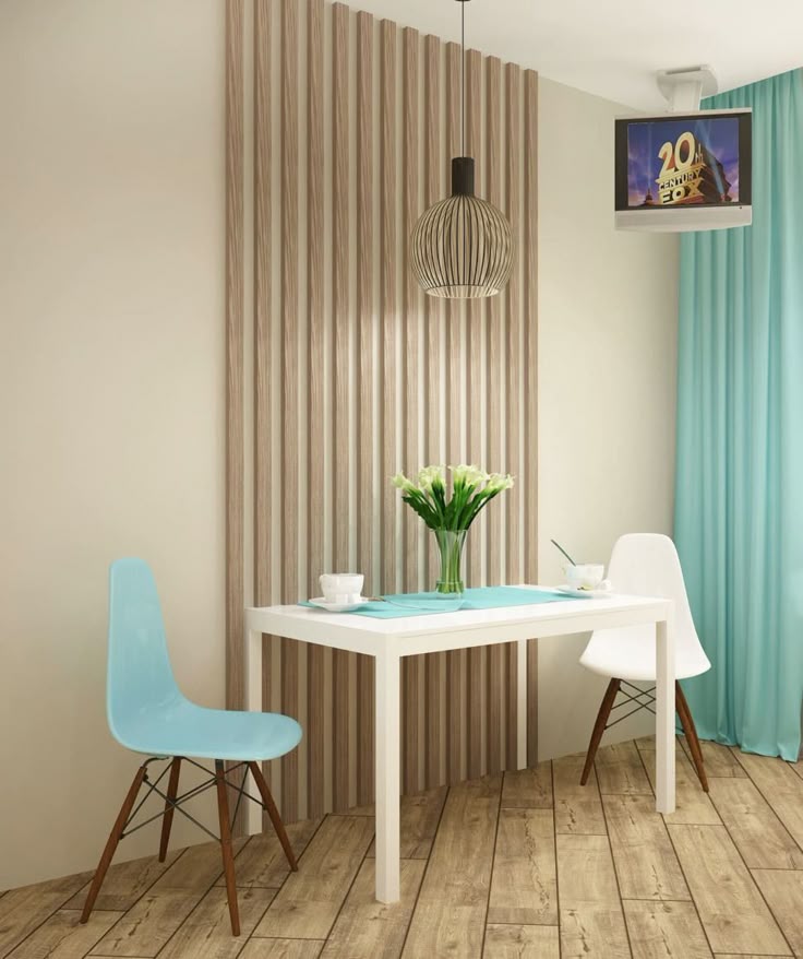 В отделке стен могут использоваться любые подходящие по цвету и фактуре материалы. Варианты отделки стен на маленькой кухне представлены на фото.