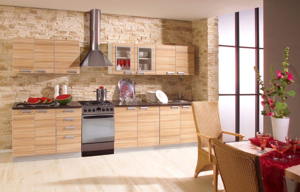 Если вы любите этнические мотивы, то выберите для отделки дерево зебрано. Из него могут быть выполнены фасады кухонного гарнитура, но если вы считаете, что слишком полосатая кухня – это излишество, сделайте вставки из необычного дерева на гладкоокрашенных стенах, дополните ярким «африканским» стеклянным фартуком.