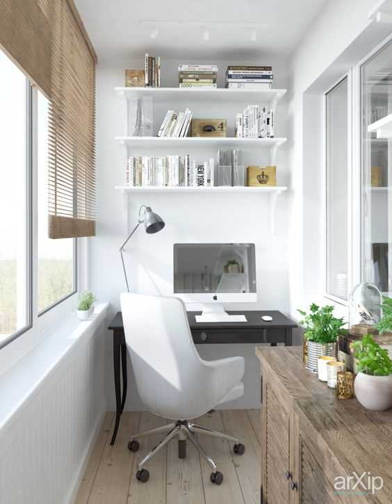 Такой вариант приходит на ум в последнюю очередь, а напрасно — стандартная рабочая зона не занимает много места, поэтому под нее можно выделить балкон вместо отдельной комнаты. Она включает узкий стол, которого достаточно для ноутбука и канцтоваров, офисное кресло и настенные полки.
