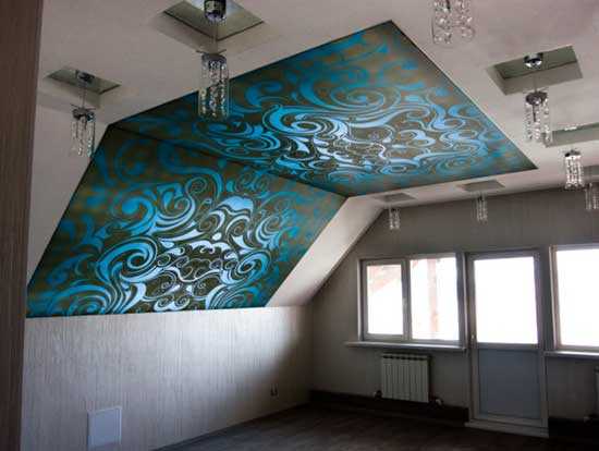 Натяжные потолки на мансарде, фото использования полотна с рисунком в декоре помещения