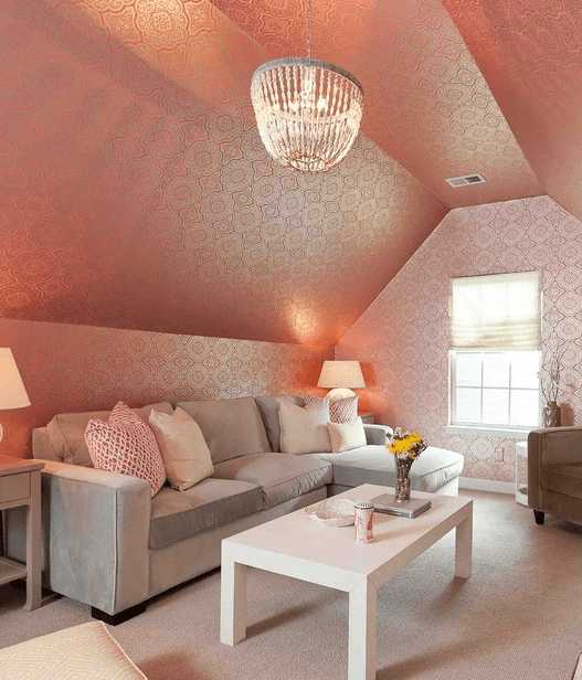 Приглушенный розовый обоев прекрасно гармонирует с мышиным серым мягкой мебели и белым столиком. Обстановка, настраивающая на комфорт создана, благодаря наклеенным на потолок обоям.