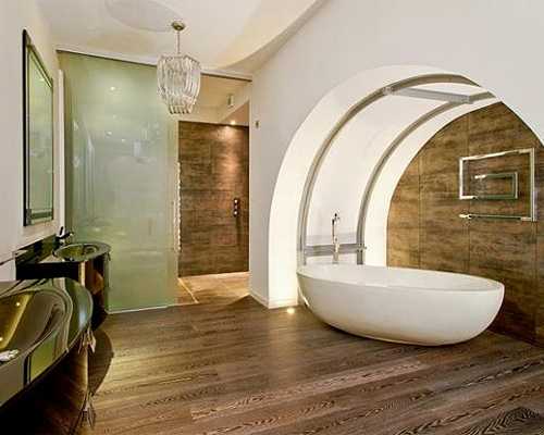 Сохранив аналогичный порядок расположения предметов, мы можем попробовать сделать комнату еще более «плавной» и свободной. Для этого ванна размещается в полукруглой нише, раковины и тумбы подбираются с закругленными углами, зеркало вешается круглое или овальное.