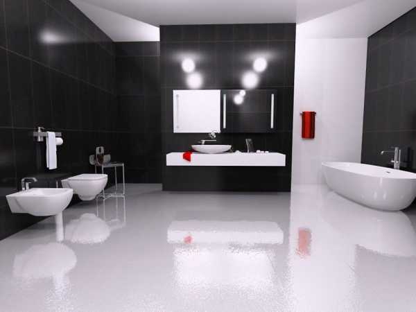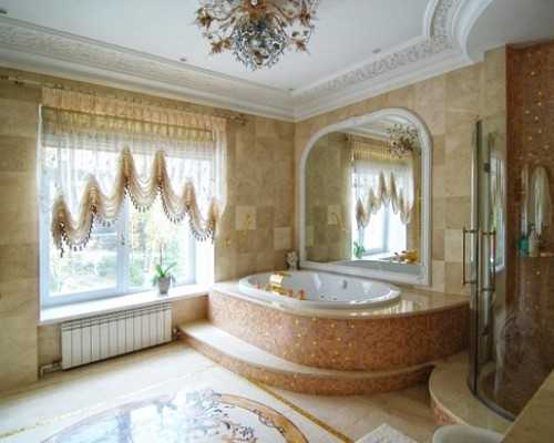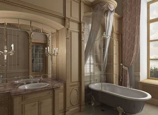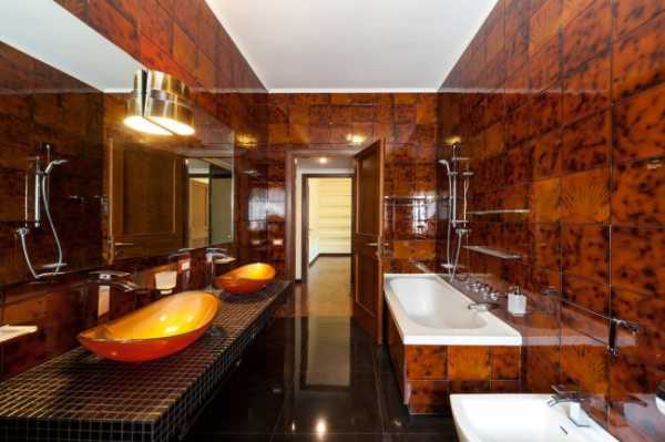 Стиль может быть любым – от строгого минимализма до помпезного барокко. В отличие от маленьких помещений, цветовая гамма может быть абсолютно любой, с яркими и контрастными оттенками. В таких помещениях обычно устанавливают сдвоенные умывальники и ванны с отступом от стены.