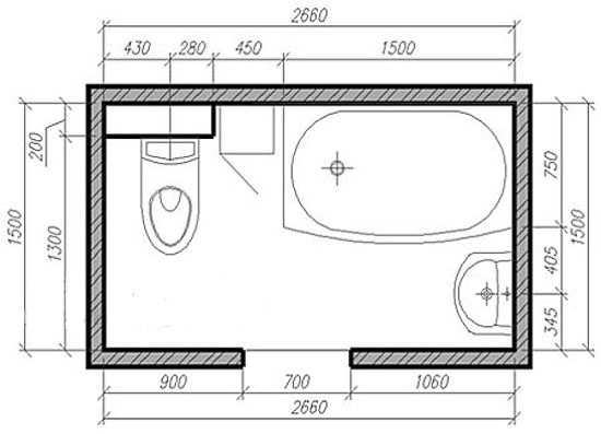 При планировке ванной комнаты основным фактором, от которого нужно отталкиваться – расположение двери, которая может находиться на длинной или короткой стене. Рассмотрим основные варианты организации пространства.