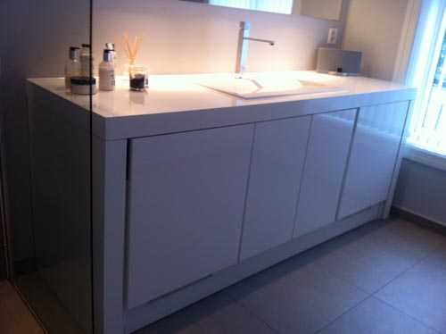 Угловая столешница – не только для кухни, смело используйте ее в ванной, расположив под ней стиральную машину и выделив место для умывальника. У вас появится свободная поверхность довольно внушительных размеров для размещения всевозможных косметических и гигиенических средств.