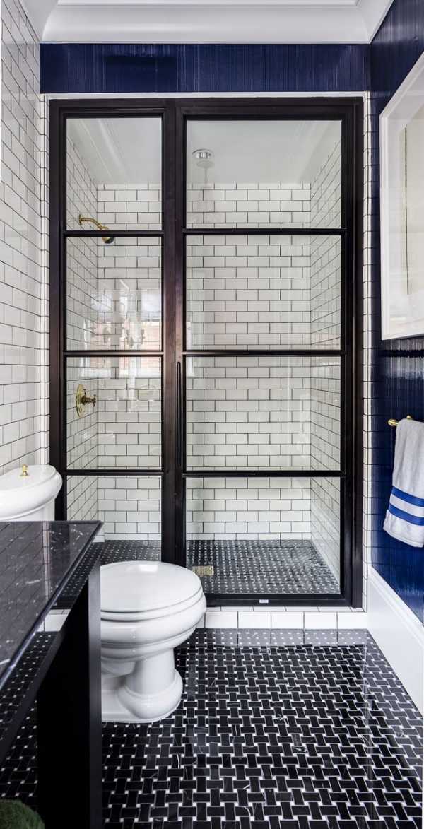 Скандинавский интерьер ванной и элегантные темно-синие элементы в черно-белом интерьере