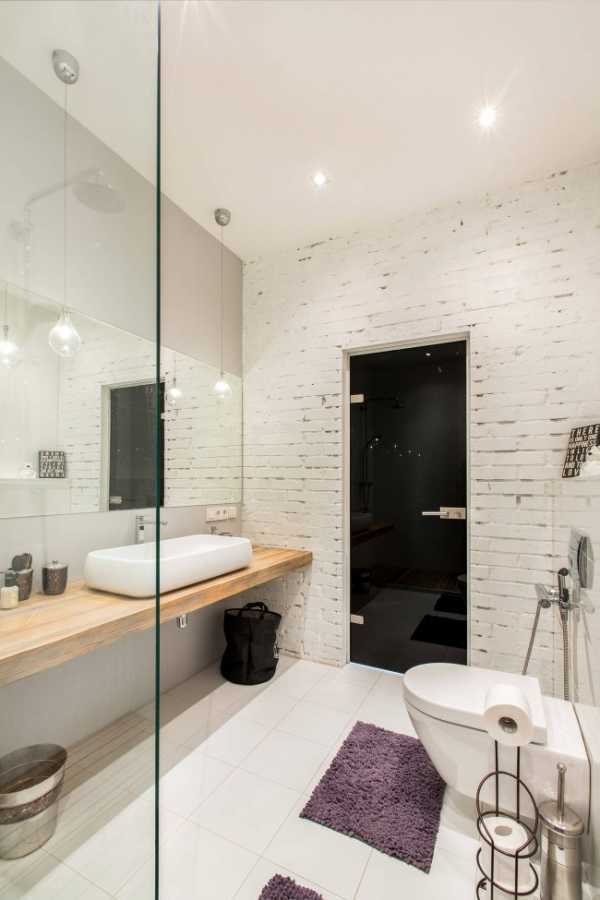Совмещенный санузел в современном стиле с душевой вместо ванны. Примечателен здесь выбор отделки: на одной стене сохранена открытая кирпичная кладка