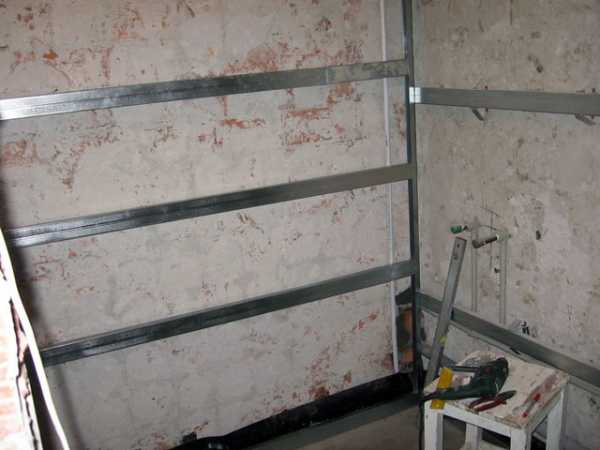 Примечание: под коммуникации – трубы, проводку в деревянных рейках или металлических профилях обрешетки прорезают пазы по месту. Перед обрешеткой необходимо замерить высоту, на которую коммуникации выступают над стеной, и толщину элементов обрешетки выбирать на 5-10 мм больше.