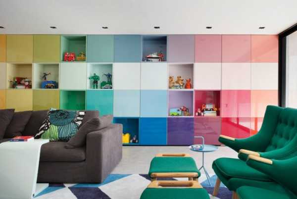 Очень яркая инсталляция из разноцветных квадратов представляет собой пусть необычное, но вполне законченное панно. Конечно, традиционной или нейтральной такую отделку стен не назовёшь, да и создать подобное своими силами будет не так уж просто. Но зато какой оригинальный эффект!