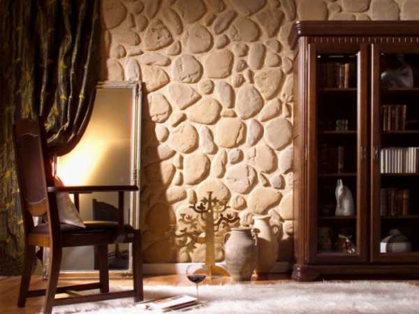 Крупные камни в отделке стен встречаются редко, хотя выглядят более эффектно, чем мелкие. Для того чтобы подобная отделка действительно украсила интерьер, рекомендуем выкладывать ими стену целиком, оставляя свободное пространство между соседними камнями.