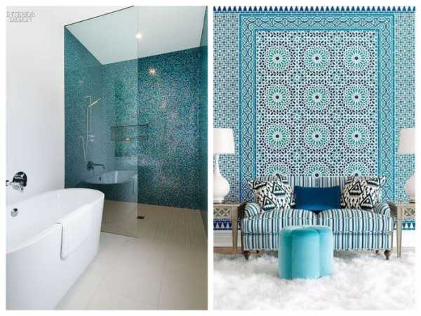 Если желаете выйти из зоны комфорта, присмотритесь к мозаичной стене в спальне. Дизайнеры часто используют мозаику цвета морской волны, с бирюзовыми, белыми, голубыми вкраплениями (подойдет, кстати, как для ванной, так и для спальник). Эти цвета успокаивают, расслабляют, а когда на стене играет солнце – кажется, что у вас перед глазами плещется вода.