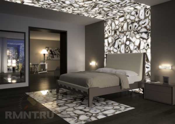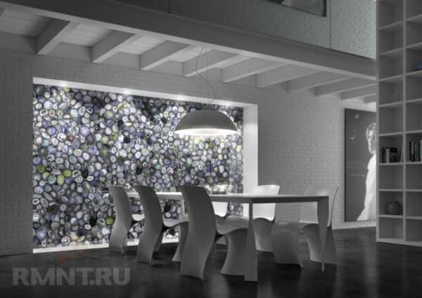 Сделать интерьер по-настоящему роскошным можно с помощью использования полудрагоценных камней. В данном случае, как и при использовании цветного стекла в перегородке, нельзя забывать о подсветке. В итоге, как в этом случае, получилось настоящее панно, выглядящее очень дорого.