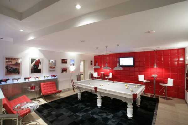 В прихожей рекомендуется использование панелей или плитки, в каминном зале — обоев, в бильярдной так же.