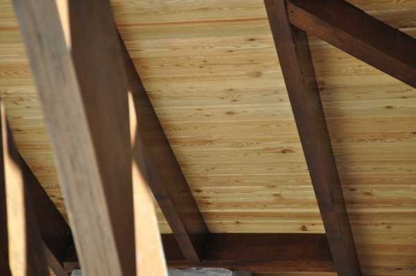 - Расположить все детали подшивки последовательно: один их край скрепить с брусом, смонтированным к стене, другой же − с доской, расположенной по стороне стропил.