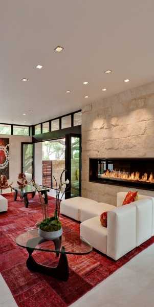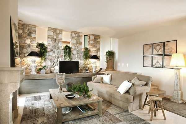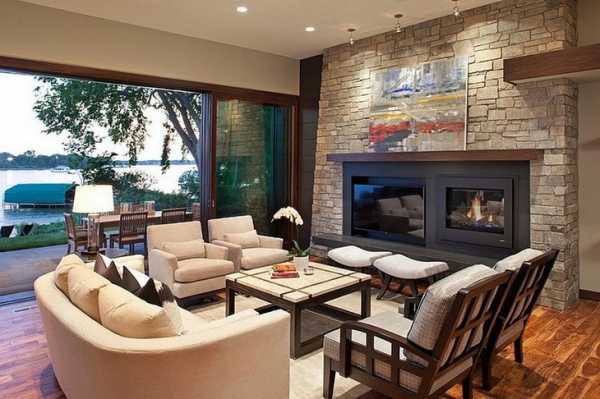 Каменная отделка очень красиво смотрится в тандеме со всевозможными фонтанчиками, аквариумами и вьющимися растениями. Просто замечательно каменные плиты будут смотреться в качестве отделочного материала камина, полочек возле него, ниш, а также дверных и оконных проемов, откосов. Например, красивая отделка декоративным камнем углов на фото видна очень хорошо. В больших помещениях можно использовать отделочные материалы большого размера. Они еще больше подчеркнут обилие свободного пространства. Не стоит применять подобную отделку в узких комнатах, ведь они будут смотреться как мрачные подземелья, в которых просто невозможно будет долго находиться.