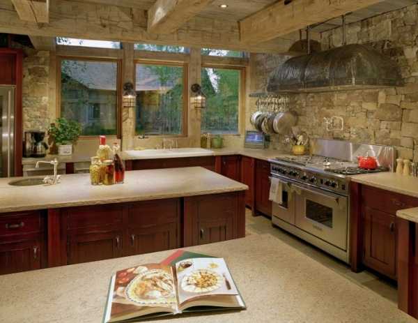 - Облицевать все стены декоративным камнем. Подобное решение сделает из кухни средневековый замок, поэтому вкупе с ним лучше всего ввести туда какой-либо элемент средневековья: к примеру, очаг, на котором можно разместить плиту. Также красиво с таким вариантом будет смотреться декоративная роспись стен.