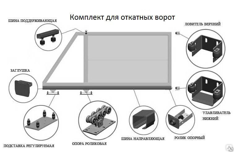 Комплект для виготовлення відкатних воріт, це набір технологічно правильно підібраних, підготовлених елементів, що дозволяють виготовити і встановити відкатні конструкцію самостійно. Іншими словами — це конструктор для дорослих, дозволяє зібрати відкатної тип воротін самому.