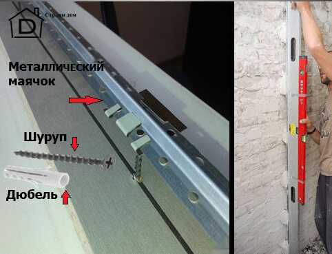 - Сначала нужно установить маячковые профили – ровные планки, по которым должна будет выравниваться штукатурка. Необходимо отрегулировать маячки при помощи уровня.