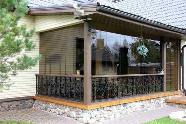 Поскольку вход в здание зачастую пролегает именно через постройку, необходимо не забыть добавить в проект крыльцо, которое можно облагородить с помощью кованых перил и ступенек из камня.
