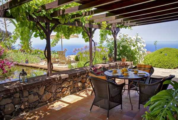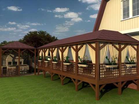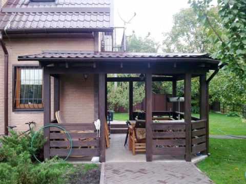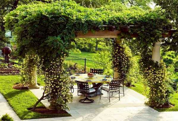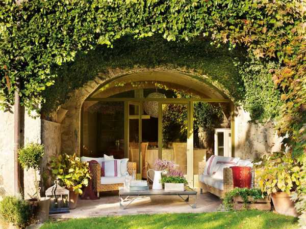 Иногда открытая терраса оформляется как отдельно стоящая площадка, примыкающая к двум другим зданиям (баня, летняя кухня, гараж). В качестве накрытия используется живая изгородь из вьющихся растений.