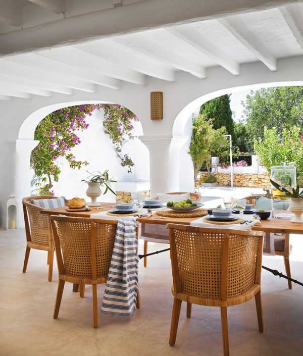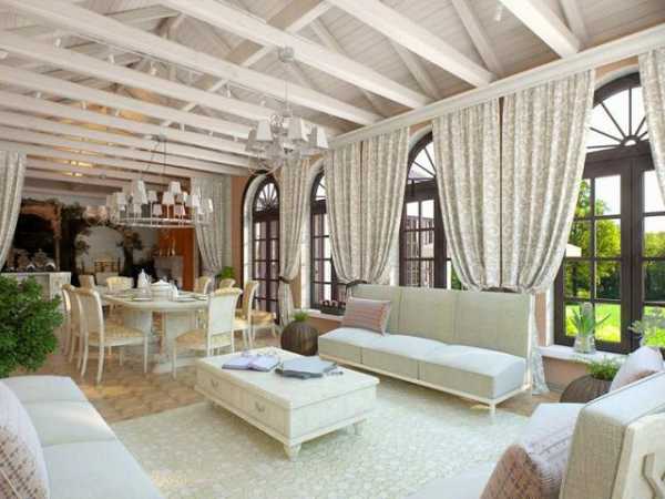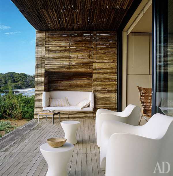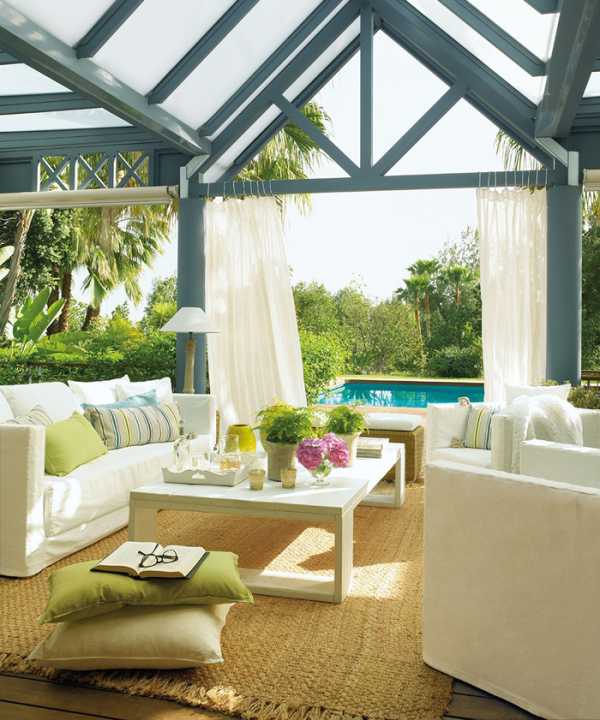 Для защиты от солнечных лучей и ветра можно использовать шторы. Получится импровизированная летняя беседка, как на фото. Шторы для веранды или террасы на даче, являются отличным способом подчеркнуть общий дизайн, но использовать их можно только при нормальной погоде. Шторы из прозрачных тканей дополнят дизайн террасы на даче в торжественных случаях. А дизайн помещения в обычные дни подчеркнут льняные или акриловые шторы. Удобными в эксплуатации на даче являются практичные рулонные шторы для веранды и террасы. А шторы из ткани блэкаут в рулонах еще и светонепроницаемы. Если у вас дизайн террасы загородного дома оформлен в стиле эко или деревенском, то вам подойдут бамбуковые шторы. Шторы из бамбука ничем не отличаются от известных «римских штор». А эти легкие и практичные шторы идеально подчеркнут любой дизайн.