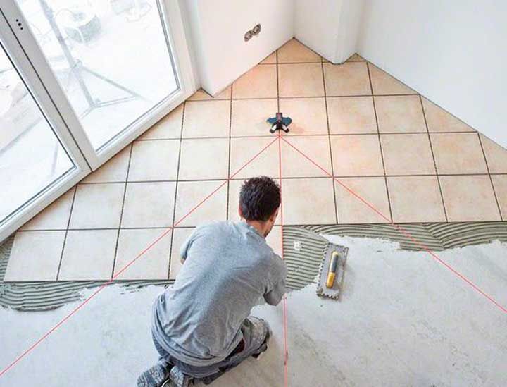 Как и с отделкой стен, с полом нужно быть внимательным. Не стоит полагаться на идеальную ровность стен, поэтому укладку напольной плитки лучше начинать тоже со второй линии. В этом случае вам также поможет строительный уровень и длинный профиль.