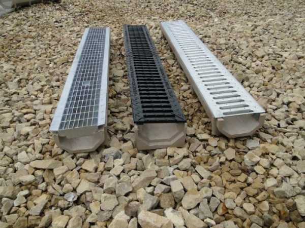 Каналы представляют собой желоба с глубиной 5-10 см. Сверху они накрываются металлической решеткой, которая служит защитой от проникновения внутрь камней, листьев и мусора.