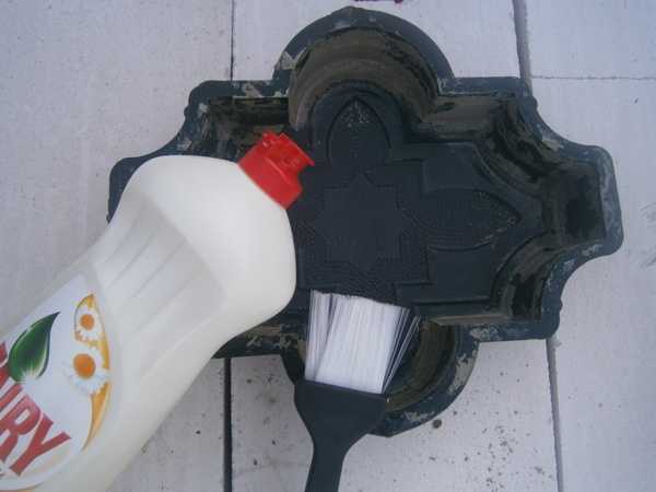 Перед тем, как начинать заливку раствора по формам для тротуарных плиток, формы следует смазать специальной эмульсией для более легкого извлечения раствора. Подобные эмульсии в большом ассортименте есть на рынке, однако мы приведем более простой способ, распространенный среди домашних мастеров — на внутреннюю поверхность формы следует нанести тонкий слой средства для мытья посуды — можете использовать любое. Нанесите жидкость на внутреннюю поверхность заливочных форм с помощью небольшой кисти.