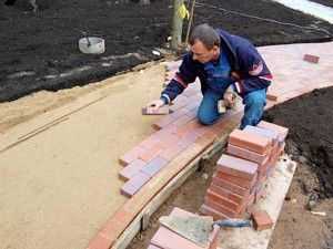 Каждый камень необходимо осаждать, делать это нужно с небольшим усилием, используя резиновый молоток. Благодаря этому плитка будет погружаться в песок и уплотняться. Если плитка имеет прямоугольную форму, то второй ряд нужно выкладывать, начиная с половины кирпичика, и далее чередовать ряды. Такой способ сделает кладку более плотной и красивой.