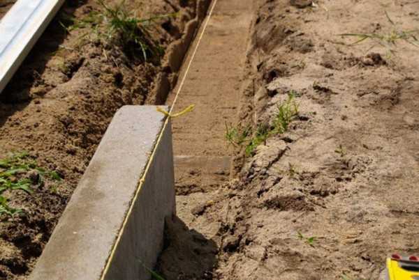 - Выкапывается траншея, опоясывающая по периметру отмостку. Ширина канавы должна быть в 2,5 раза больше толщины бордюра. Ограничительный фрагмент располагается выше уровня земли, глубина определяется индивидуально (но не менее 10–15 см).