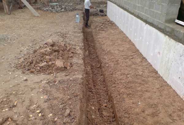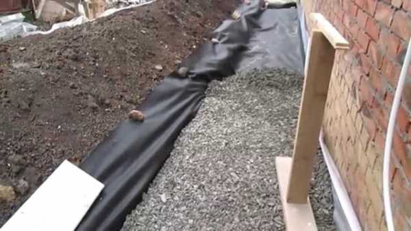 Сперва необходимо вырыть траншею и заполнить ее глиной толщиной 10-15 см. Затем ее хорошо утрамбовывают и создают уклон.- Сверху необходимо уложить ПВХ-пленку, которая будет выполнять роль гидроизолятора;