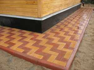 - Установка декоративного покрытия – тротуарной плиткой отмостку покрывают на самом последнем этапе, соблюдая технологию укладки. Для этого сухую смесь из цемента и просеянного песка насыпают на бетонное основание, и плотно прибивают плитку резиновой киянкой. Все что нужно для завершения работ – обильно полить поверхность отмостки водой, и установить по наружной кромке бордюрные элементы.